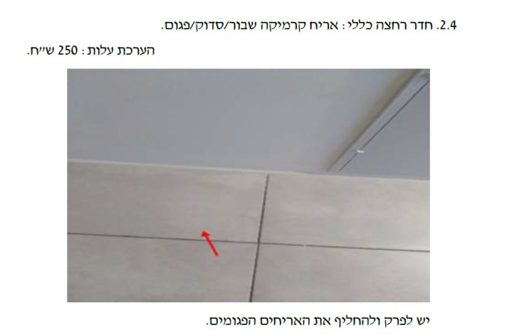 הנה דוגמא לליקוי באריח קרמיקה בחדר הרחצה, תמונה של הליקוי, הערכת העלות וההמלצה לתיקון: