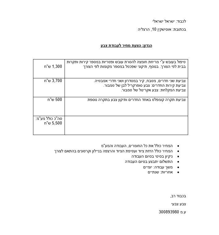 כך נראית הצעת מחיר של צבעי