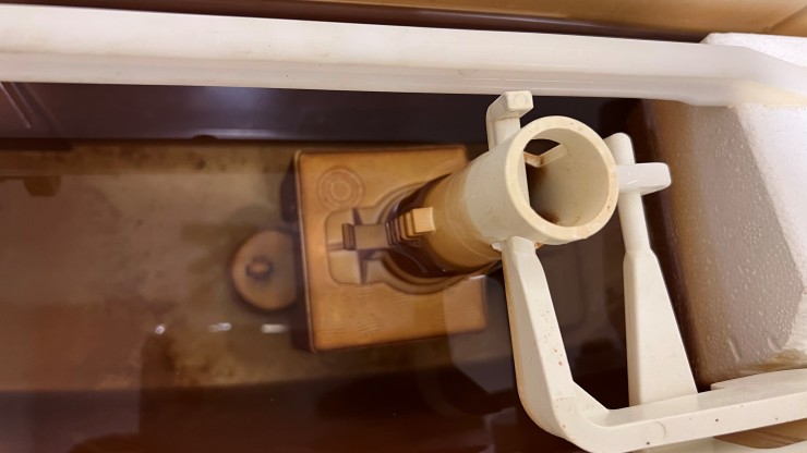 פתחו את מכסה הניאגרה: הציצו פנימה על המצוף, וו פלסטיק עם מלבן קלקר שצף על המים.